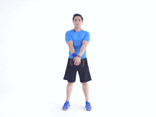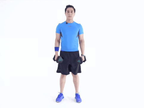 1.站直,啞鈴握在身體兩側。
