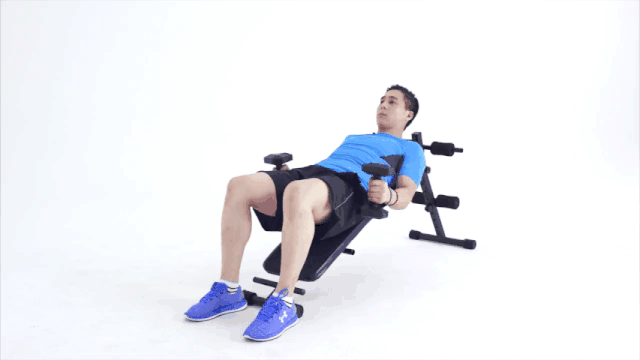 1.平躺于墊子上,啞鈴保持在胸前上推。