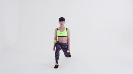 2.跨出單腳做弓箭步蹲動作,下蹲至膝蓋呈90度,后腳膝蓋會靠近地面。
